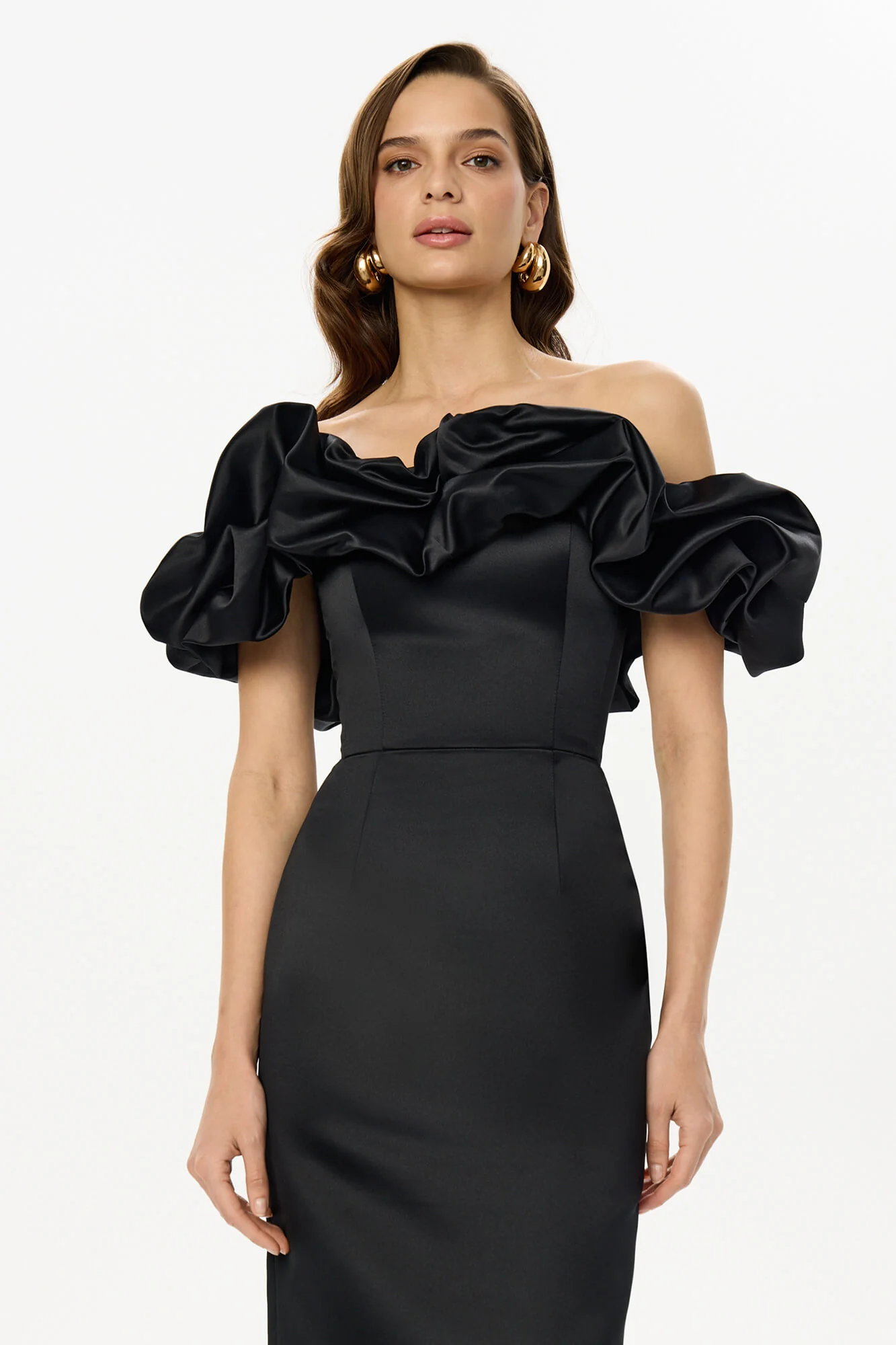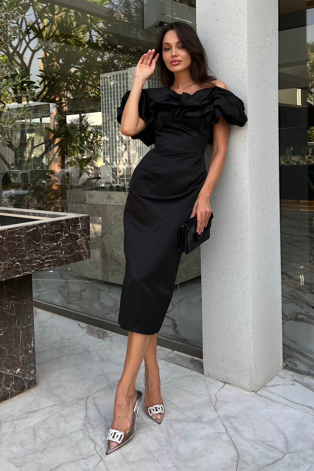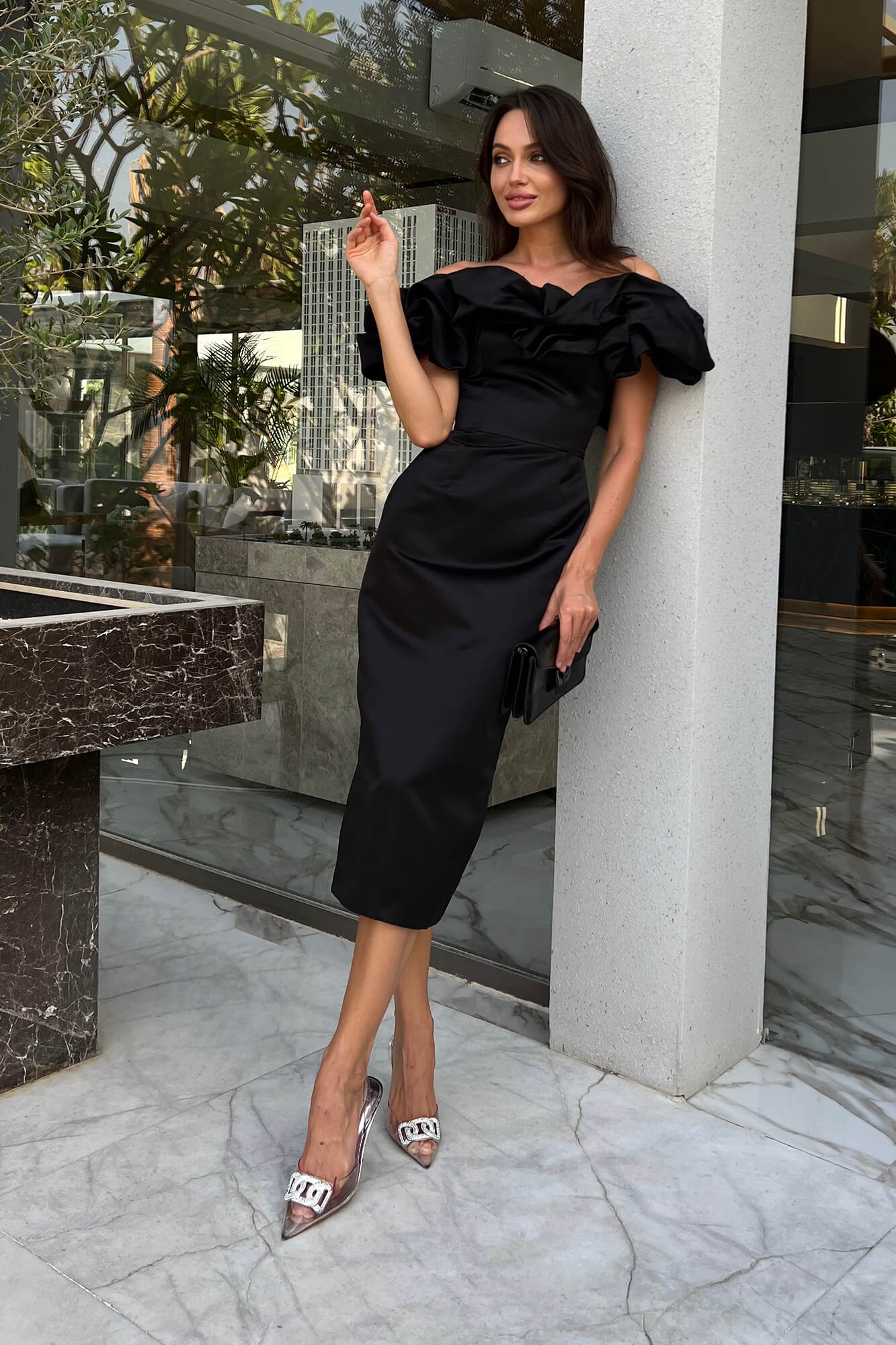 Accentuate your tender shoulders with the Meringue ruffle midi silhouette dress. The fabric is thick enough to shape your body creating seductive curves. Zipper on the back, lined.