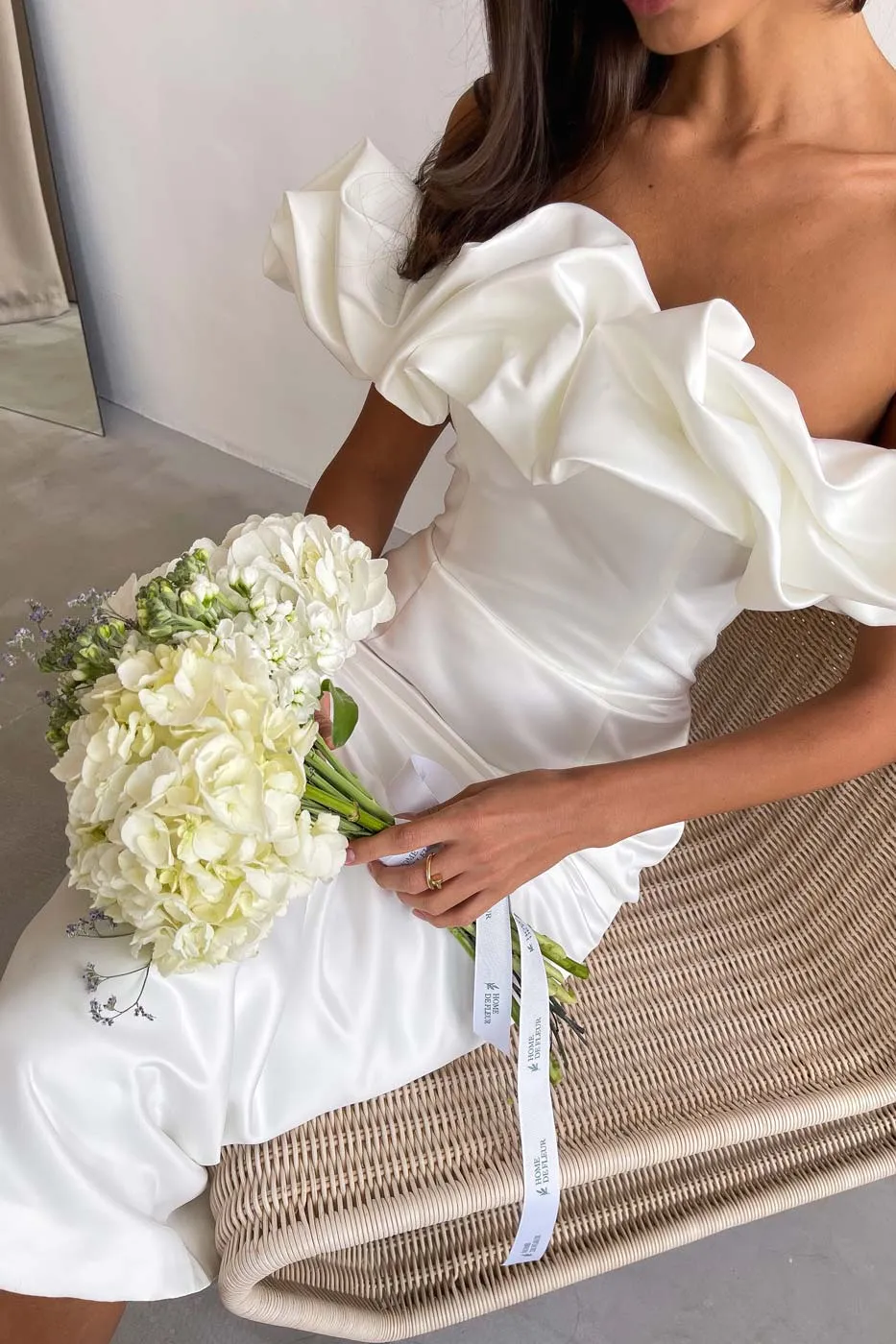 Accentuate your tender shoulders with the Meringue ruffle midi silhouette dress. The fabric is thick enough to shape your body creating seductive curves. Zipper on the back, lined.