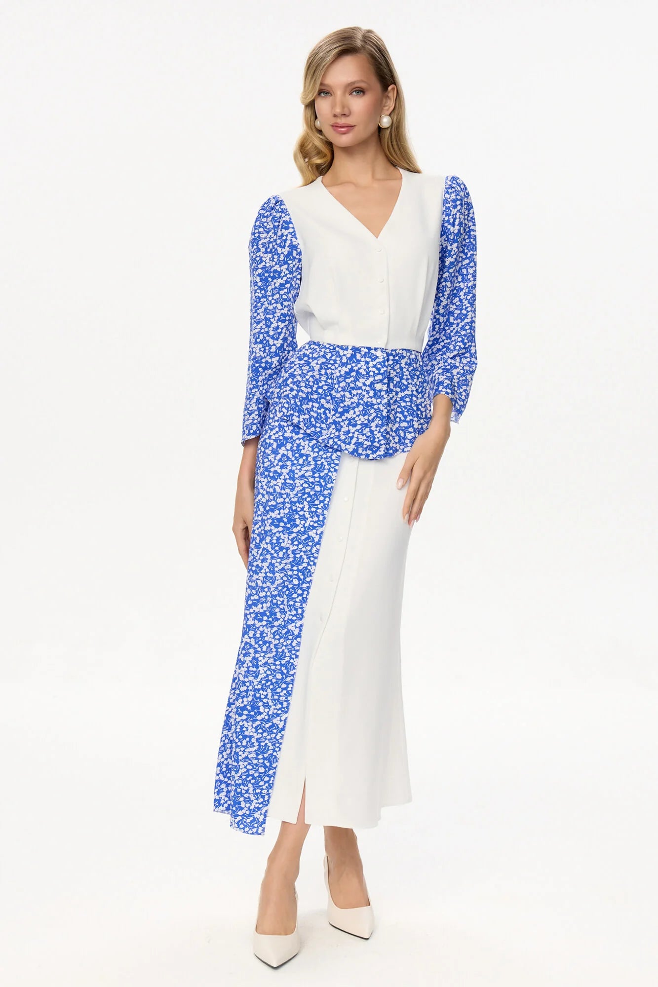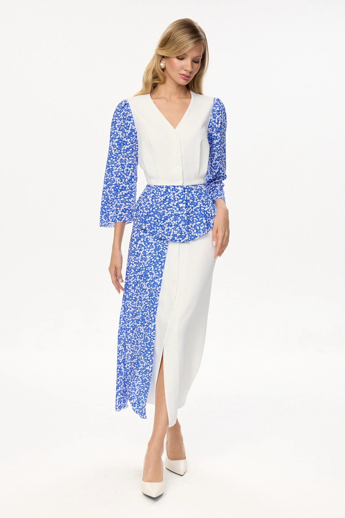 A pearly white midi skirt features decorative blue floral print fabric for a touch of elegance. The button closure allows for a variety of styling options, from a classic look with all buttons fastened to a more relaxed style with a few buttons undone. The soft, feminine fabric makes it perfect for a range of occasions, from brunch with friends to a romantic date night.