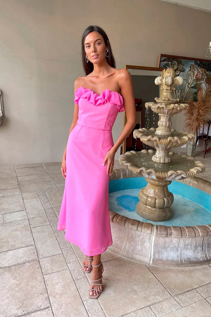 Designed for your best vacation season, this dress creates such a feminine and pleasant fashion. The flounce in the top creates a fairy and romantic feel. The textured fabric is made of soft, airy chiffon that gives off dreamy and light vibes. Complete the outfit with heels and clutch.