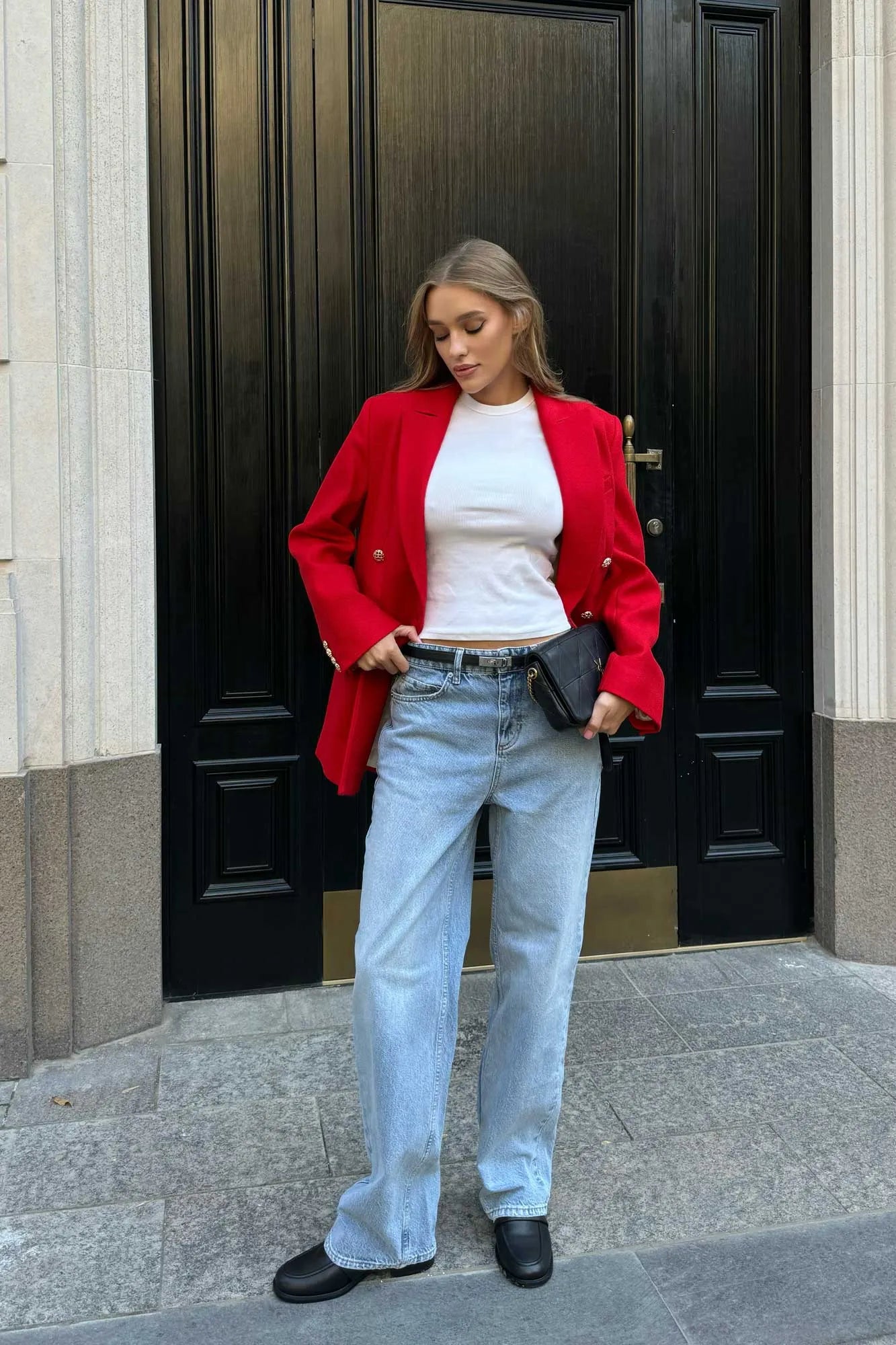 This striking double-breasted cropped jacket in a bold crimson hue is a statement piece. The sharp, notched lapels and classic double-breasted design exude elegance, while the relaxed fit ensures exceptional comfort. Perfect for layering over skirts from our new collection or pairing with jeans for a effortlessly chic style.