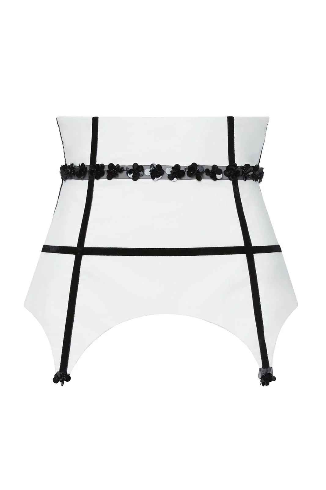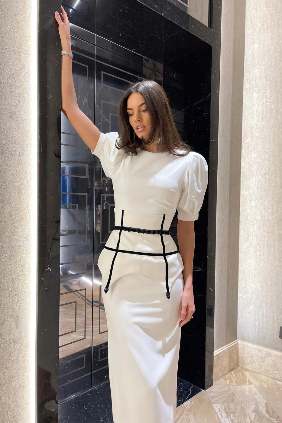 Create a luxurious look on you. Perfect for any day or night parties. The model is complemented by a decorated edging with a black floral decorated belt. Invisible zip fastener.