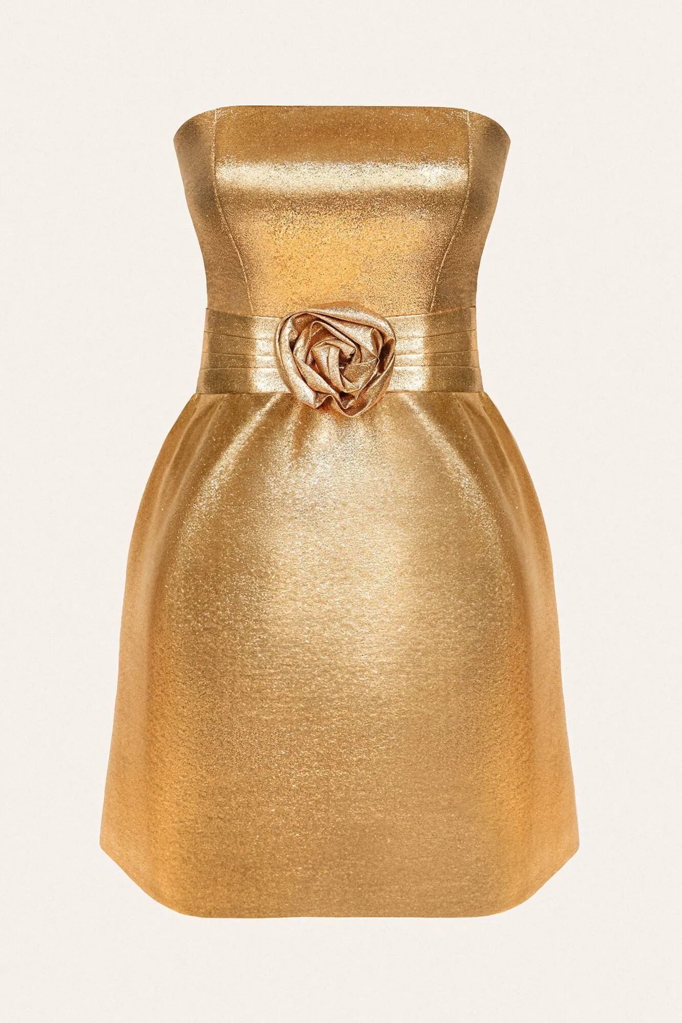Shimmering sophistication in a golden mini sheath dress. Its form-fitting silhouette and open shoulders are enhanced by rich fabric texture. A rose-embellished belt accentuates the waist. Complete the look with elegant sandals and a minimalist gold chain bag.