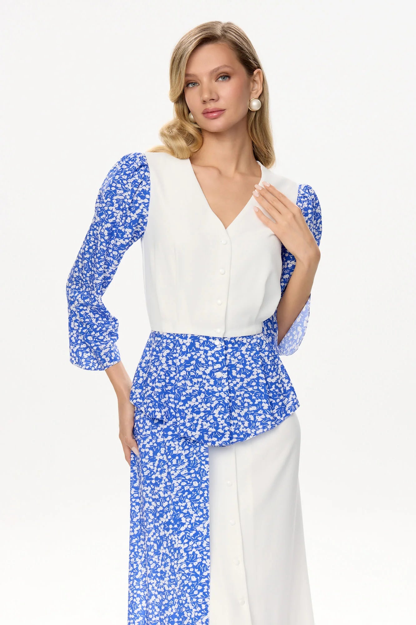 A soft blue blouse with a floral print on the sleeves and peplum adds a touch of romanticism to any outfit. The 3/4 sleeves are flattering and versatile, while the deep V-neckline elongates the neck. The peplum adds a feminine touch and creates a flattering silhouette. Pair it with a skirt in a matching colour for a sophisticated look.