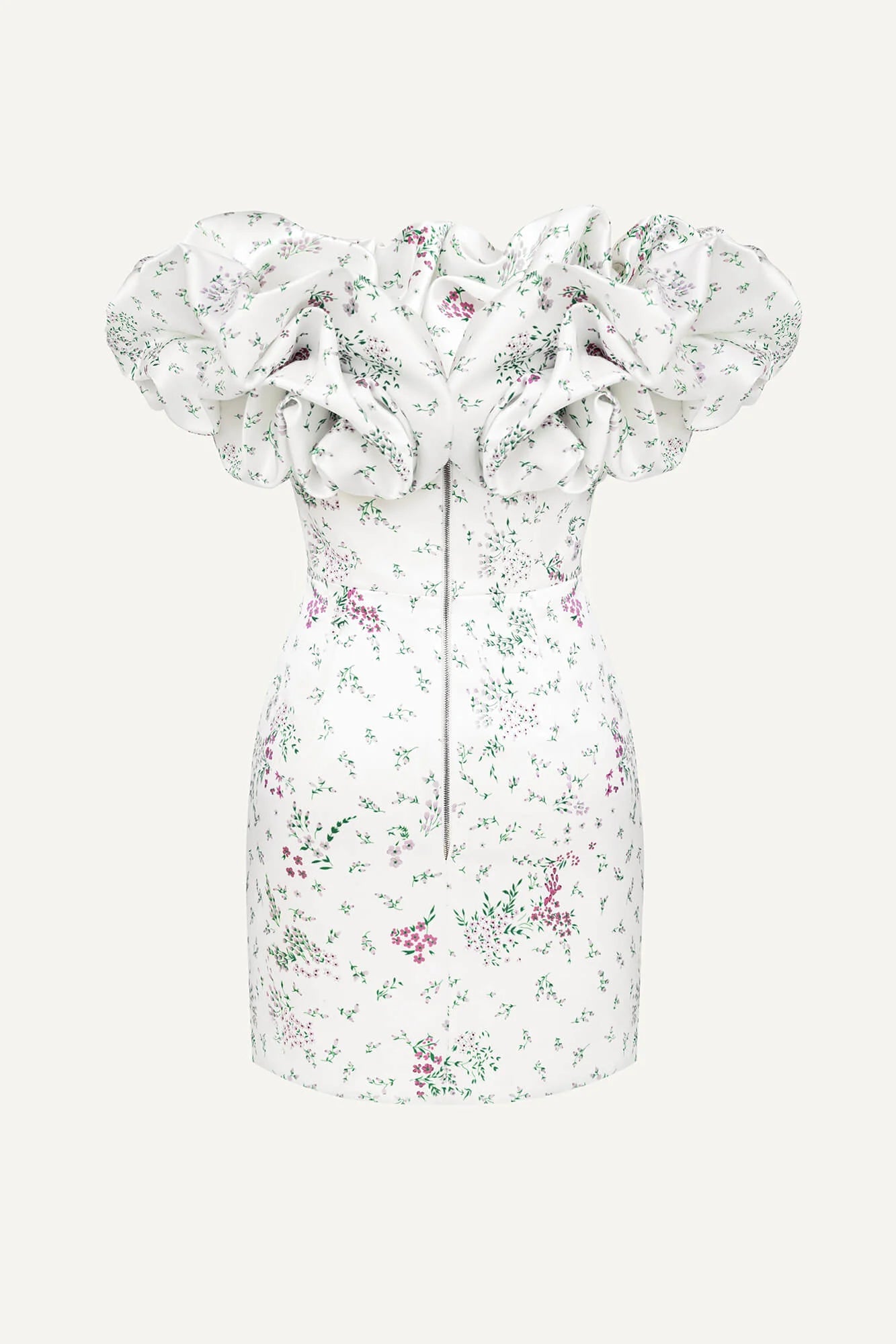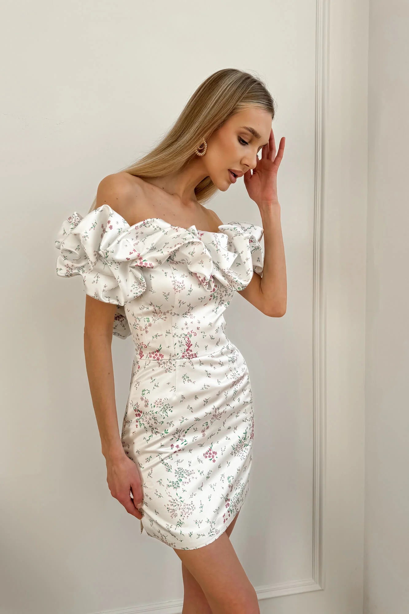 Embrace your femininity wearing our "Meringue" Floral Dress in mini length. Floral print creates such a pleasant and light vibes, flouncing on the top adds a little playfulness to the outfit. The corset makes the dress fit perfectly due to cups and bones. Made of dense fabric it holds its shape well and underlines the body shape. Lined.