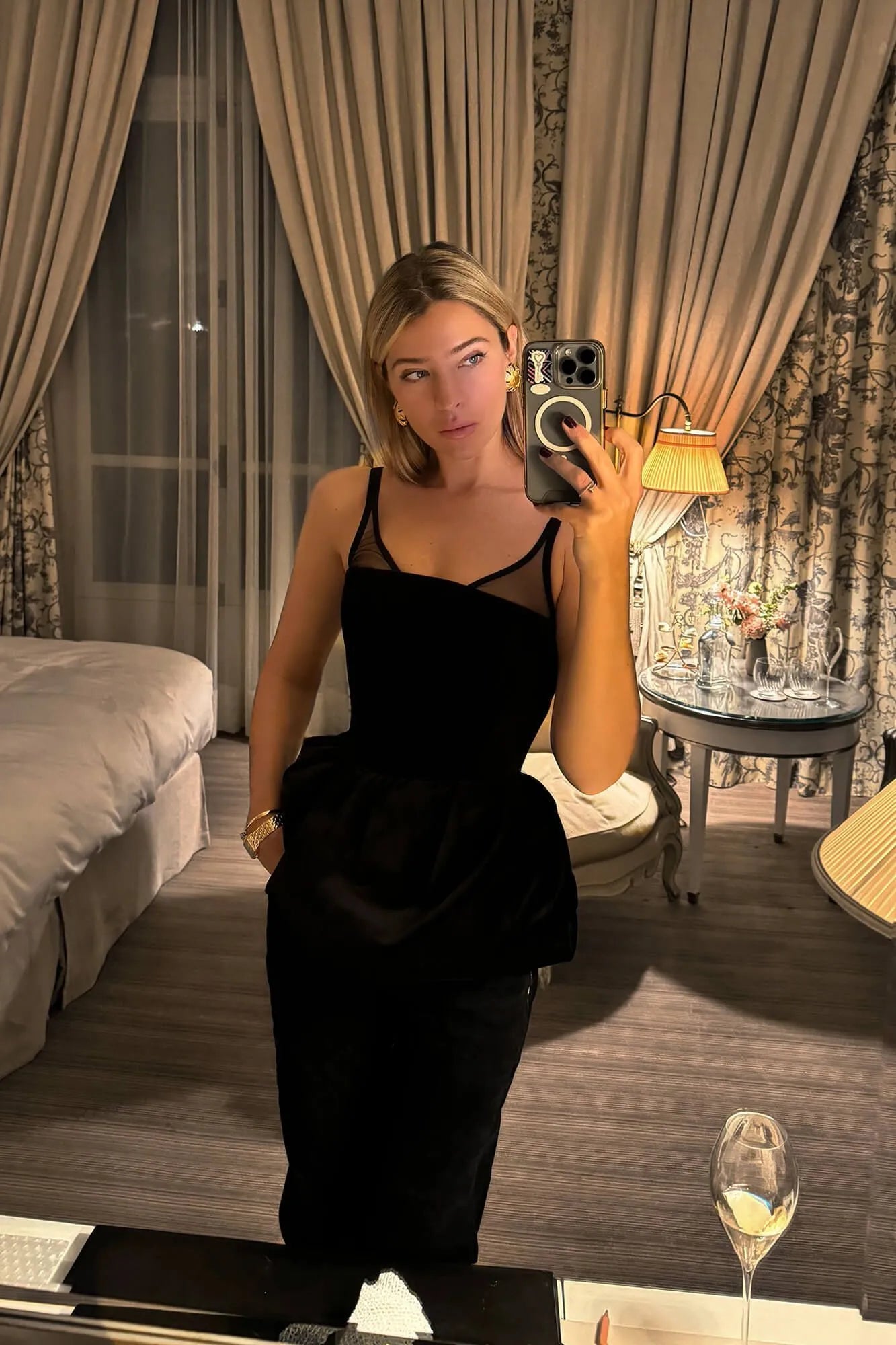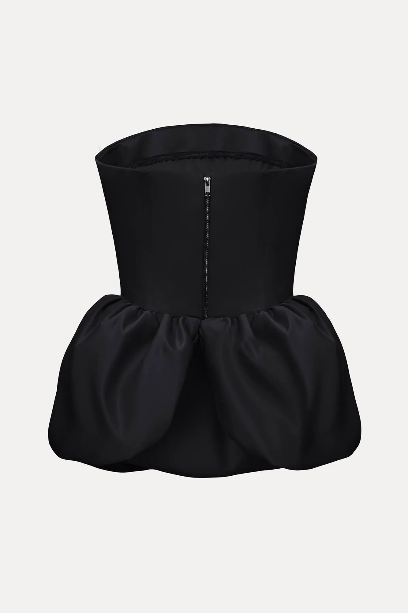 This luxurious corset top is crafted from opulent satin, creating a deep, rich color with a delicate sheen. The close-fitting design accentuates the feminine silhouette, creating a beautifully flattering shape. A dramatic, gathered basque adds volume and a touch of exquisite detail. The strapless design showcases the shoulders, adding a touch of effortless elegance. Ideal for evening events and celebrations.