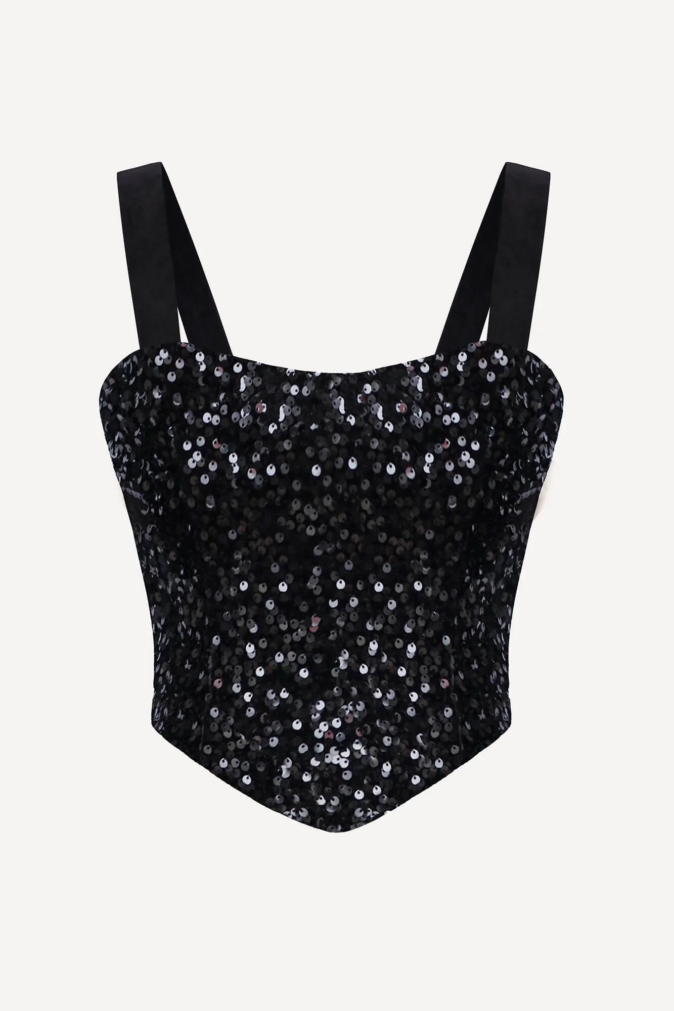 A strapless top crafted from luxurious black velvet. The dazzling fabric, adorned with sequins, exudes glamour and opulence. The deep neckline elegantly accentuates the décolletage and collarbone, while the structured corset design ensures a flawless fit, cinching the waist and creating an irresistibly alluring silhouette.