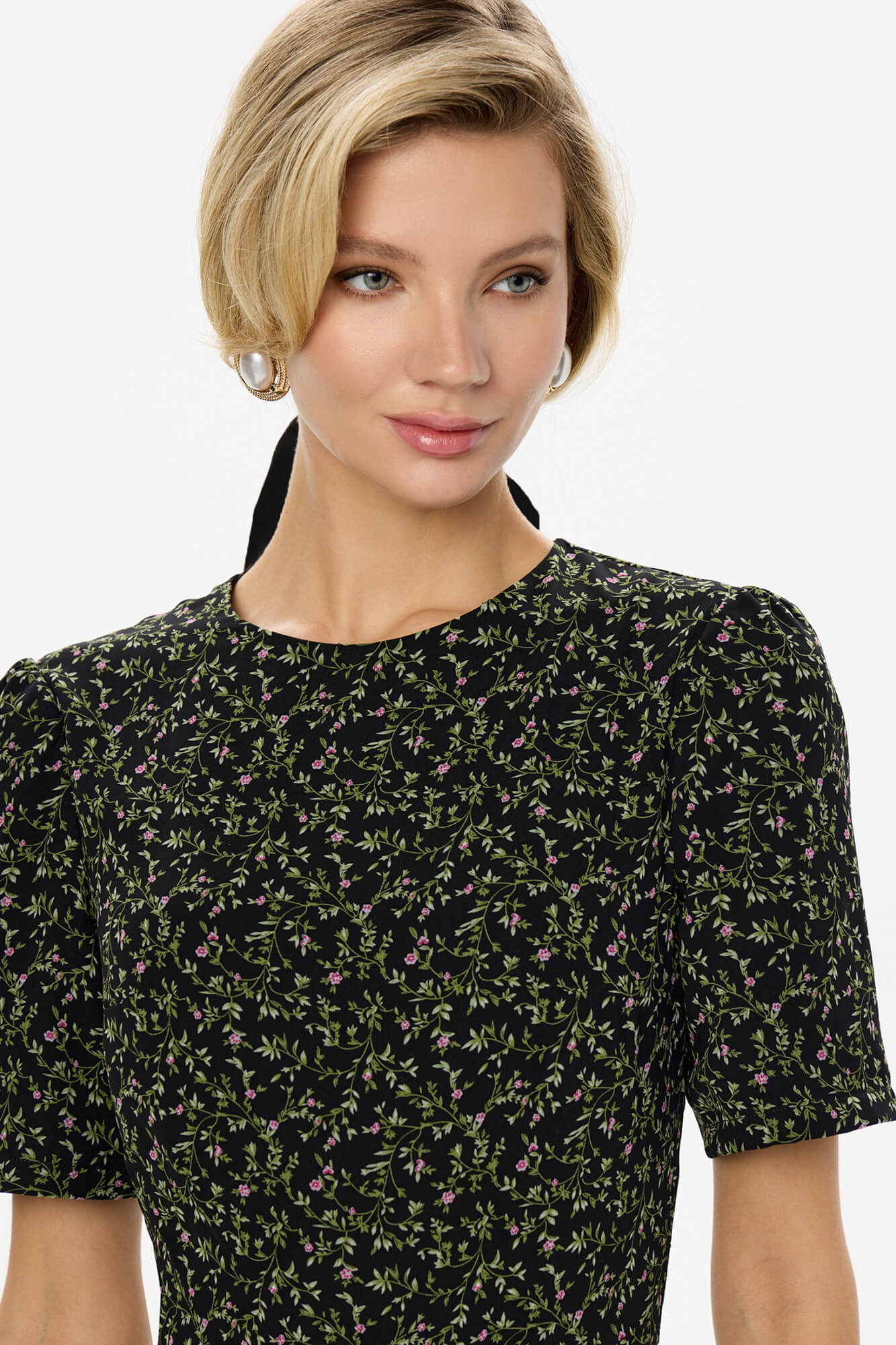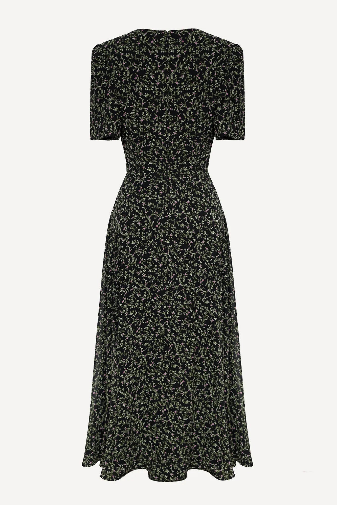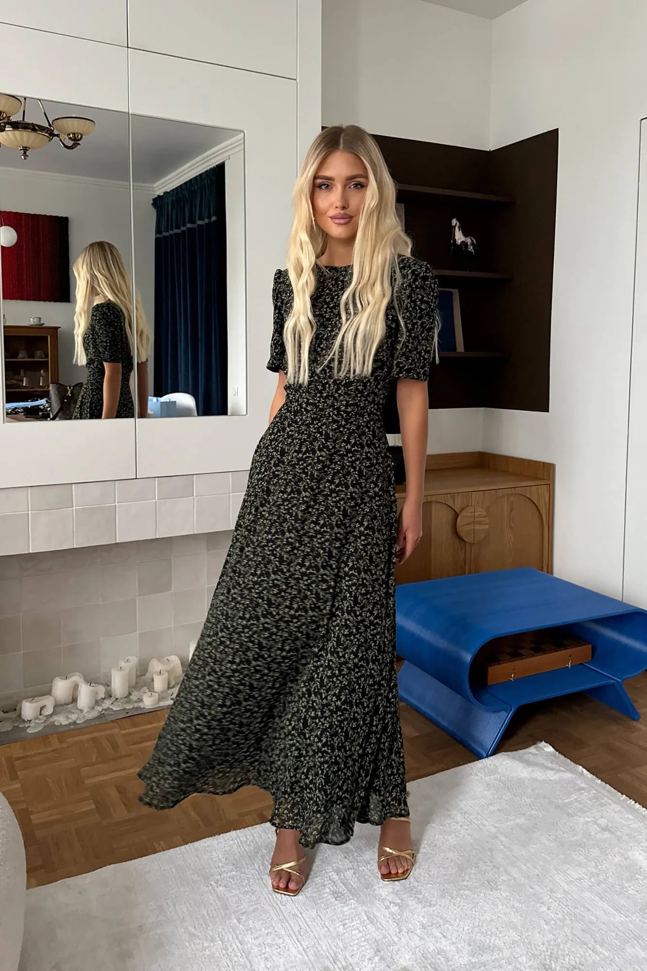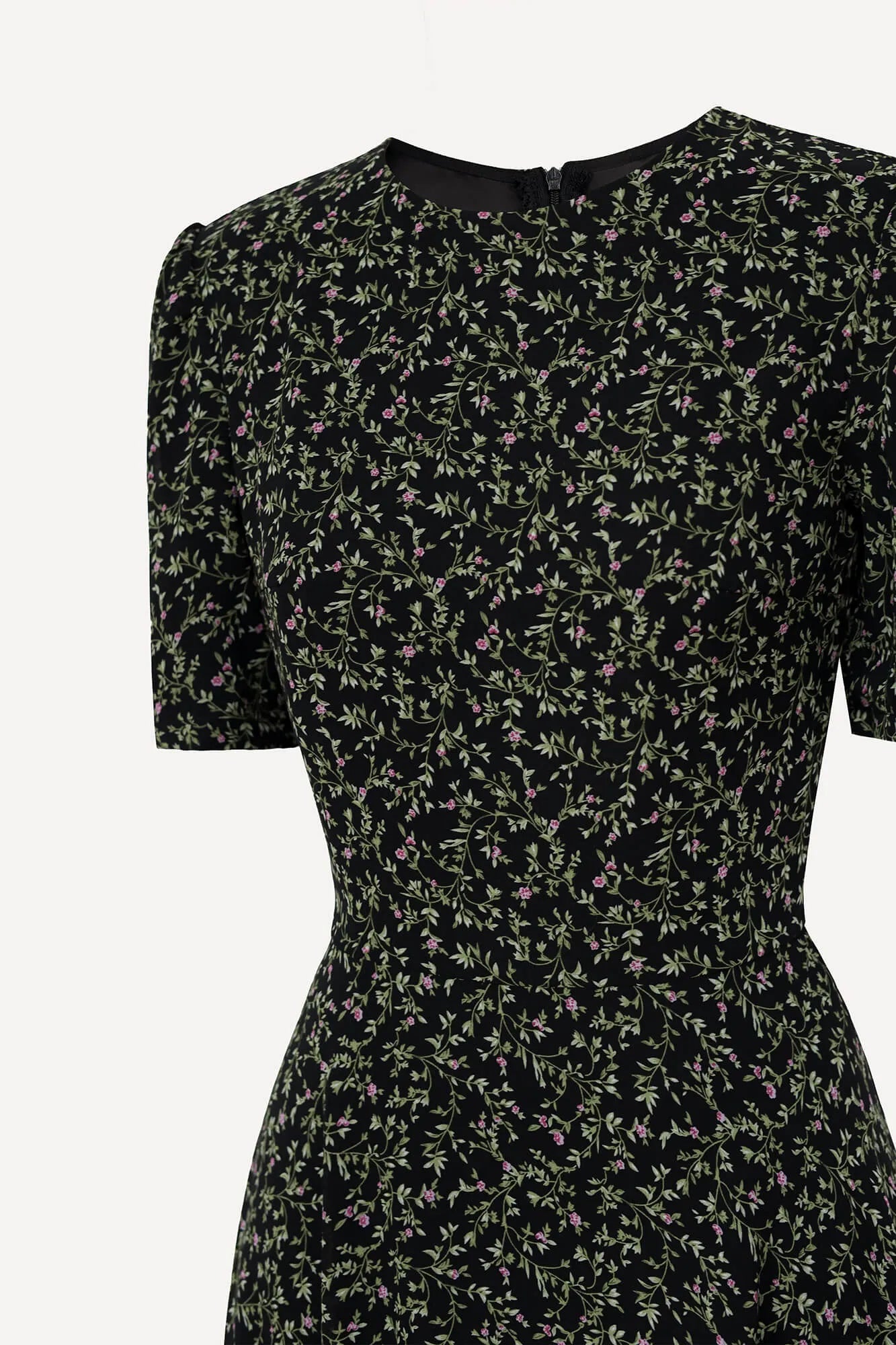 Double layer chiffon Floral Midi Dress with short sleeves. A flying sun skirt will make your look airy and delicate while the print featuring blossoms will add vivid accents. This crewneck classic silhouetted dress will defenitely become a piece of your casual summer wardrobe. Lined. Inivisible Zip Fastener.