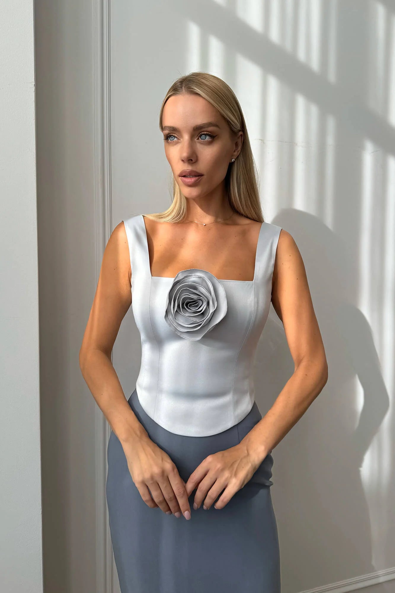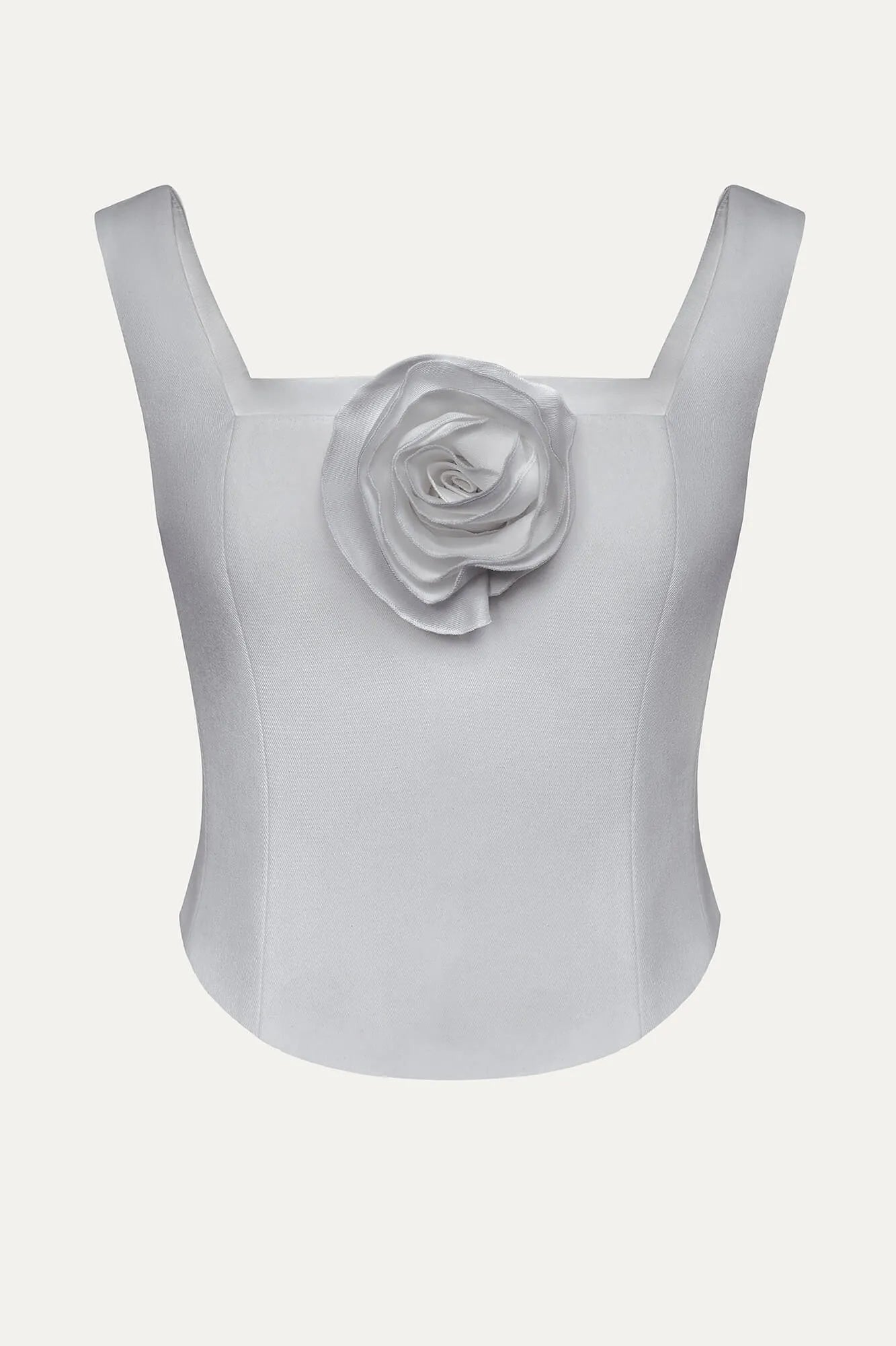 A crop top in gray with a square neckline and wide straps. Removable rose decor add tenderness and romance to the look. Fits perfectly to the bodyshape. Mix it with High Waisted Trousers or Midi Skirts. Lined.