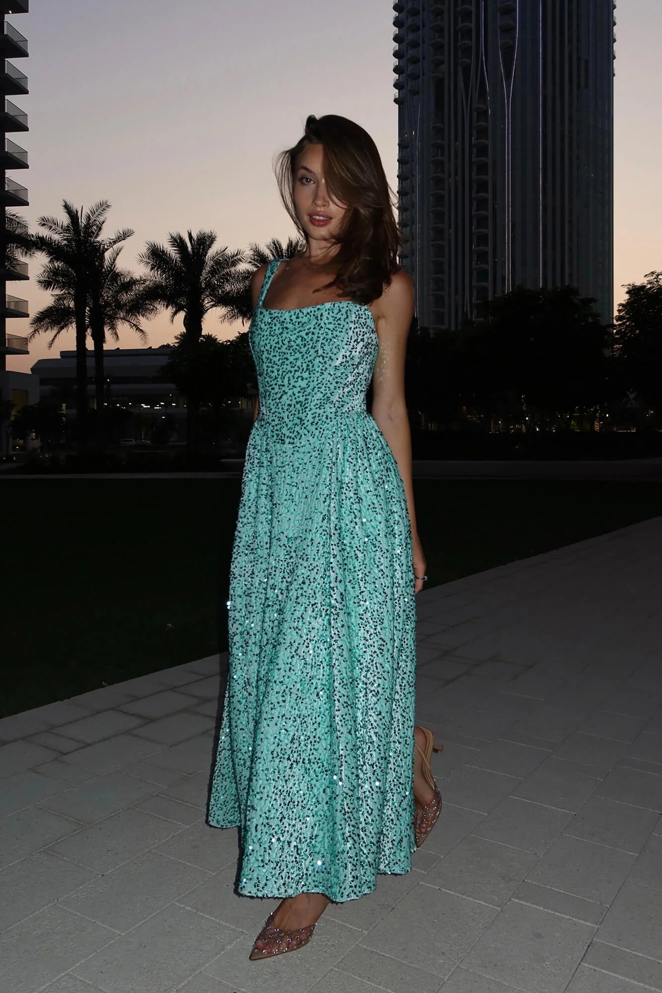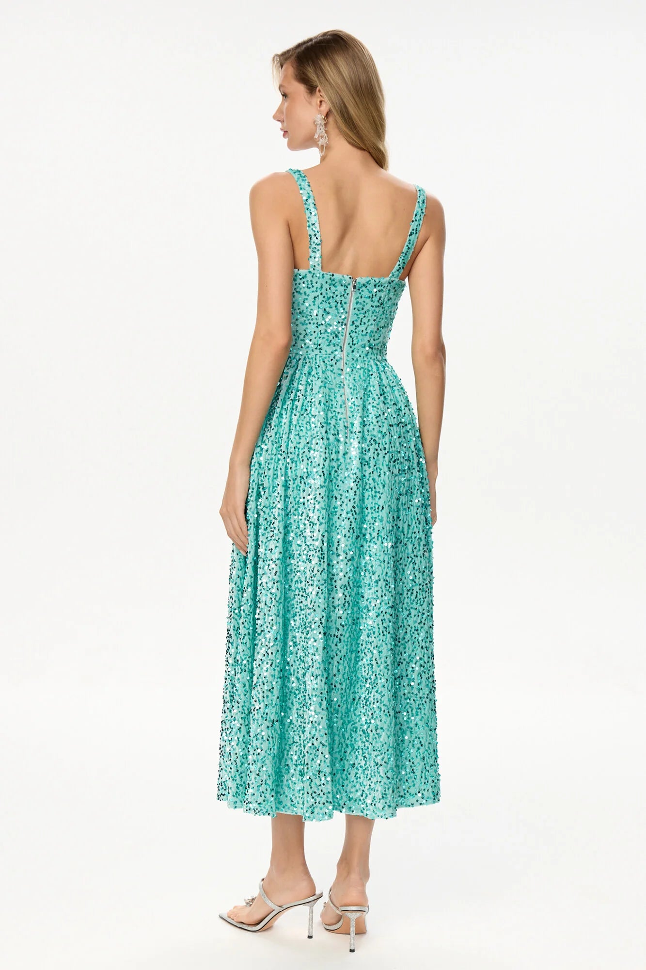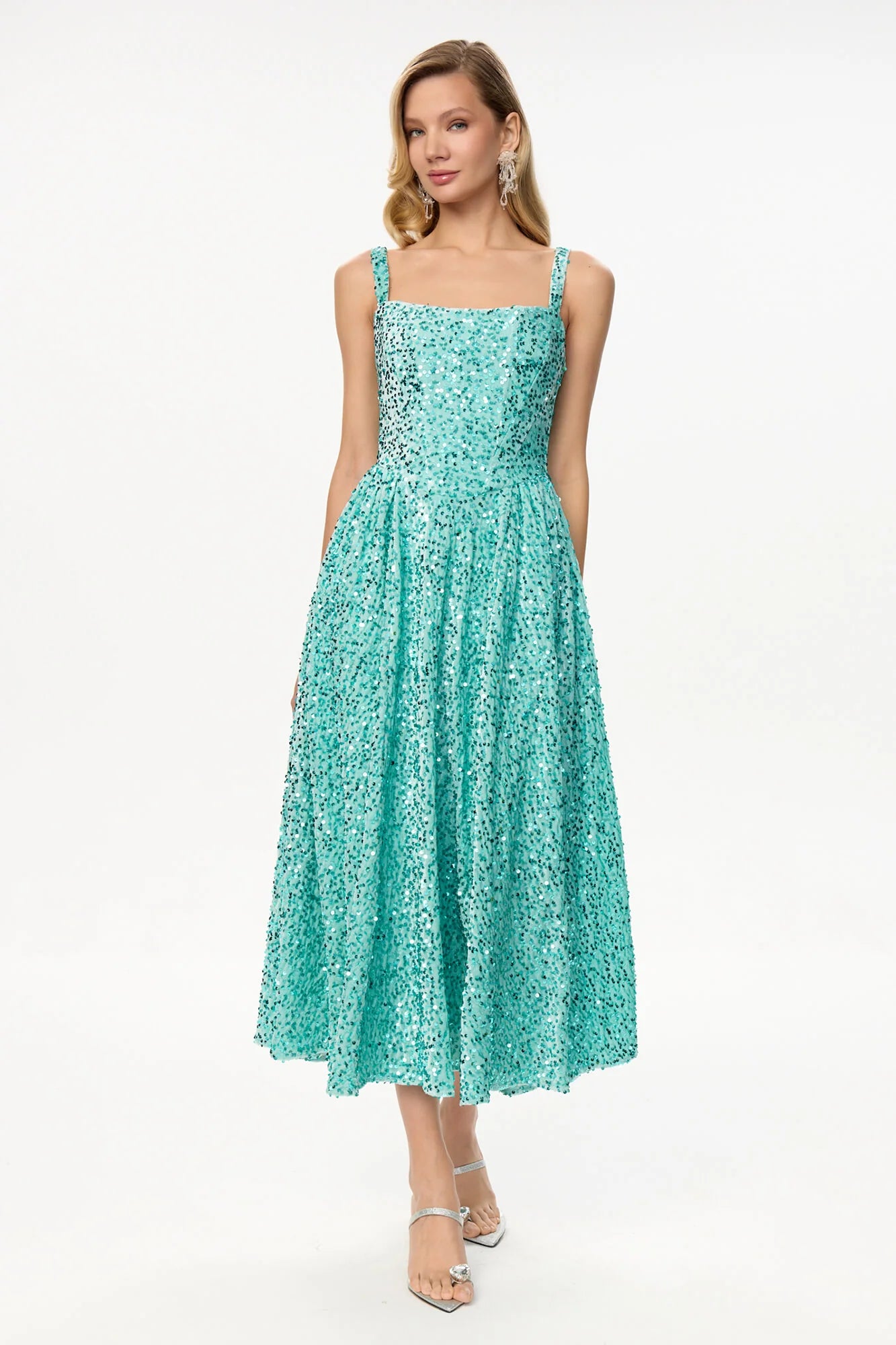 A midi dress crafted from sumptuous velvet in an exquisite menthol shade, featuring wide straps and a voluminous, flowing skirt. The dazzling fabric, adorned with sequins, radiates glamour and opulence. The deep neckline elegantly highlights the décolletage and collarbone, while the structured corset design ensures a flawless fit, accentuating your graceful contours and adding a touch of irresistible femininity and allure.